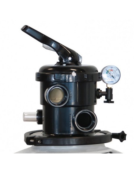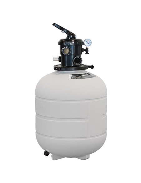 Fabricado en material plástico de una sola pieza sin uniones mediante proceso de soplado. Apertura de la tapa del filtro mediante sistema de rosca. Equipado con manómetro y purgas de aire y agua manuales integradas. Color marfil. Válvula selectora incluida. Presión máxima de trabajo: 2 kg/cm2.