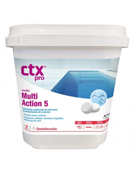 Tratamiento multiacción con cloro, 0% bórico para el mantenimiento del agua de la piscina.