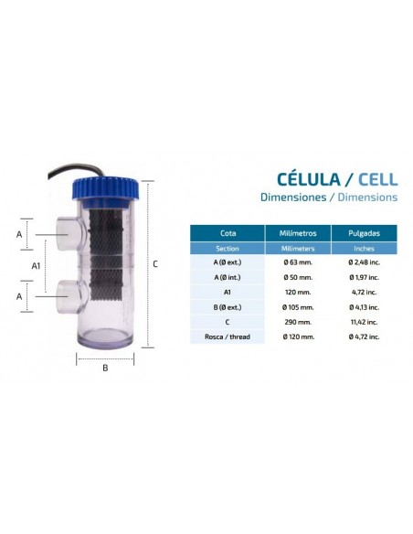 - Célula formada por electrodos de Titanio con Ru/lr. Temperatura de trabajo: 10-45ºC
